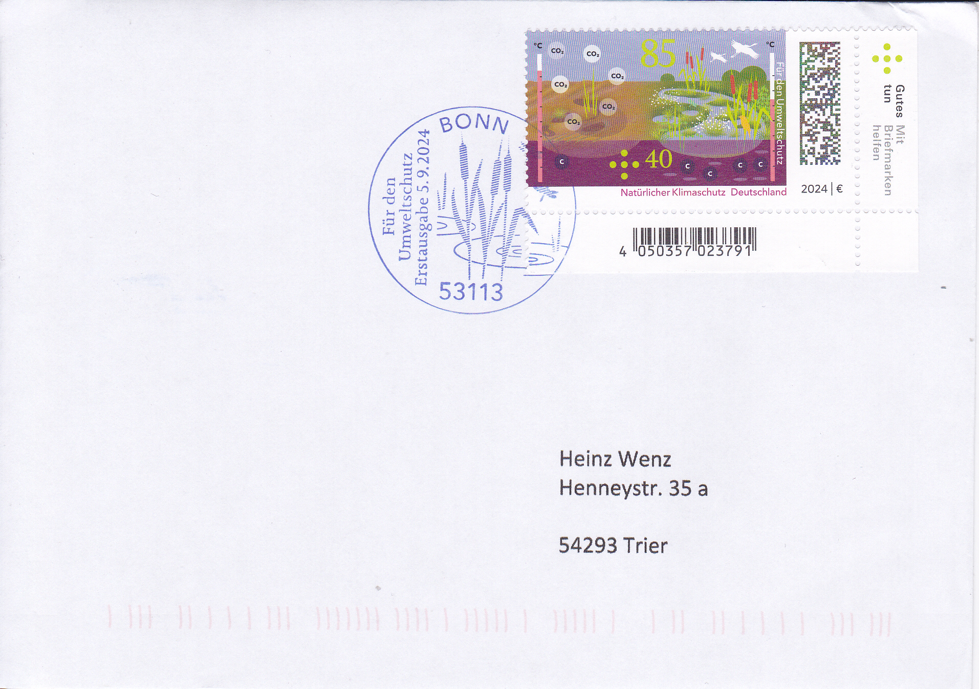 Ministerkarte des Bundesministers für Finanzen mit zwei Marken zum Umweltschutz "Natürlicher Klimaschutz" (MiNr 3850) und den beiden Ersttagsonderstempel Bonn und Berlin.