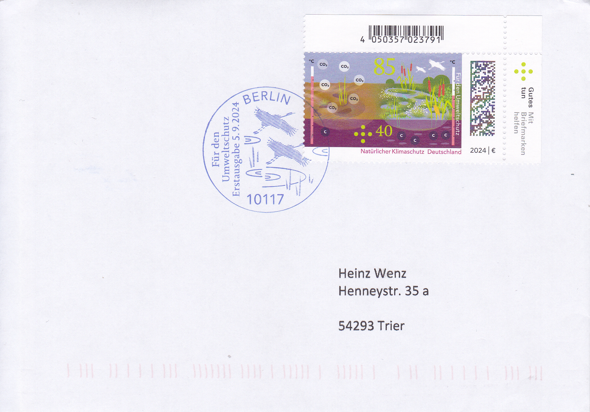 Klappkarte des Vorstandsvorsitzenden der Deutschen Post AG mit einer Marke (MiNr 3850) zum Thema "Umweltschutz - Natürlicher Klimaschutz" mit der Abbildung "Trockengelegtes und intaktes Moor" und dem Ersttagsonderstempel Bonn.