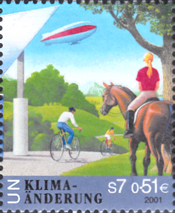 Bei der Post der Vereinten Nationen Wien erschien in einer Serie zum Thema "Klimaänderung" diese Marke (MiNr 346) mit der Abbildung von Sonnenkollektoren und einem Elektroauto beim Aufladen.