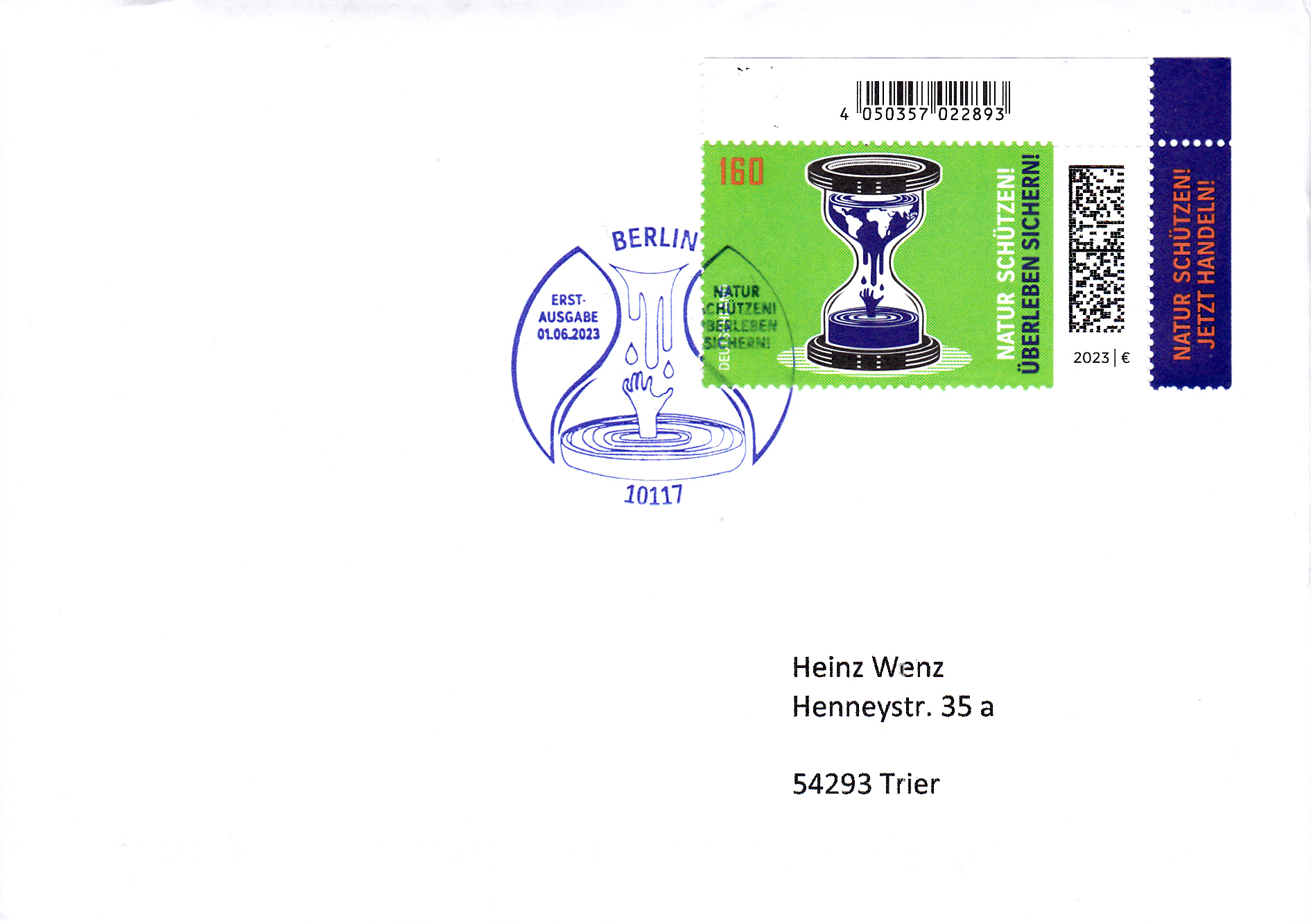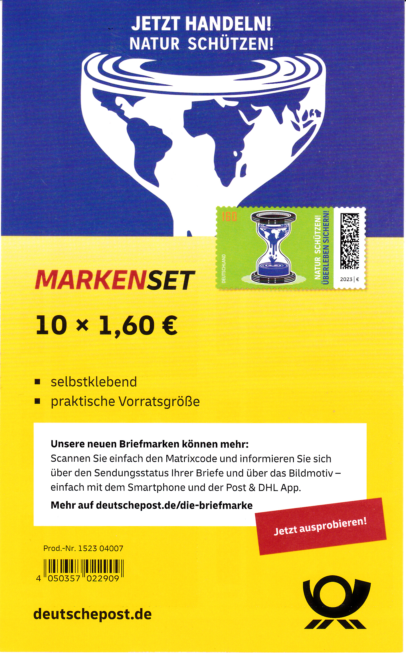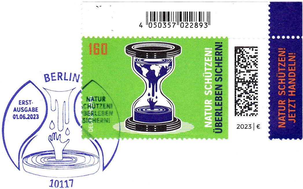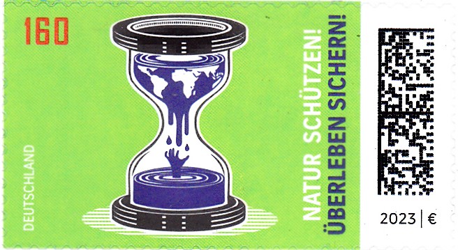 Zum Thema "Umweltschutz: Überleben sichern" erschien bei der Deutschen Post diese Marke (MiNr 3771) mit der Abbildung einer Sanduhr mit schmelzender Welt und der Hand eines Ertrinkenden. Hier zeige ich eine Marke vom Eckrand mit EAN-Codierung.