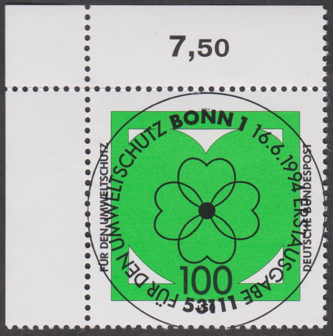 Bund MiNr. 1737 erschien am 16.06.1994 zum Thema Umweltschutz und zeigt das Motiv "Grünes Herz in grünem Rahmen", hier ein Eckrandstück links oben aus dem Bogen mit zum Markenmotiv perfekt passendem ESST 53111 BONN 1: