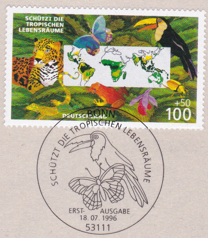 Die Marke zum Umweltschutz 1996 (MiNr 1867) ist zum Thema "Schützt die tropischen Lebensräume" und zeigt verschiedene Tiere und Pflanzen vor einer Weltkarte Hier zeige ich eine Marke mit dem Ersttagsonderstempel aus Bonn.