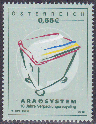Anlässlich 10 Jahre Verpackungsrecycling im ARA-System wurde in Österreich eine Marke (MiNr 2407) verausgabt. Sie zeigt einen Wertstoffbehälter.