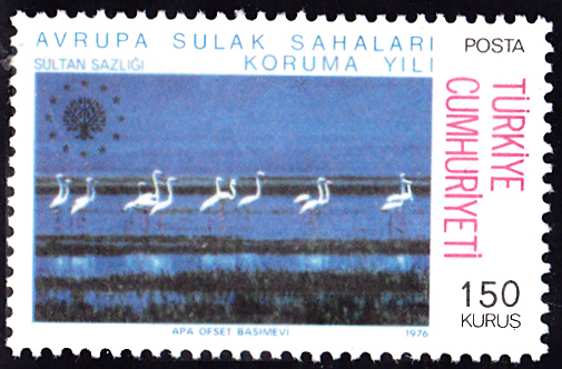 In der Türkei ist zum Europäischen Süßwasserschutzjahr 1976 in einer Serie diese Marke (MiNr 2391) mit Stelzvögel im Sultanröhricht erschienen.