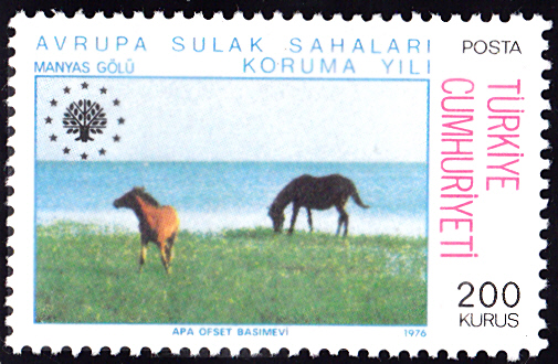 Eine zweite Marke der Serie (MiNr 2392) zeigt Pferde am Manyassee (Manyas Gölü, ein Binnensee in der türkischen Provinz Balıkesir).