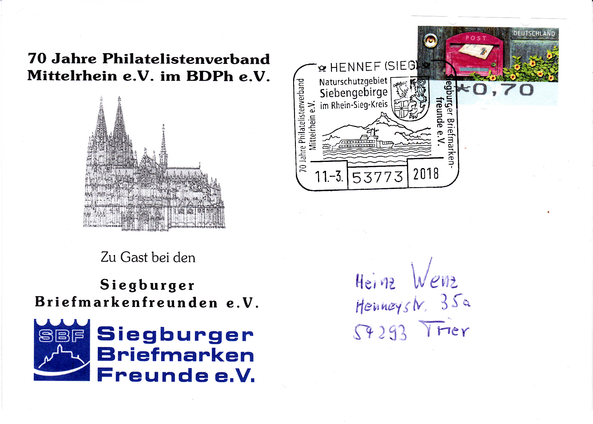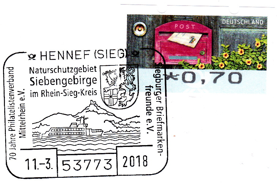 Sonderstempel vom 11.3.2018 aus Hennef mit einem textlichen Hinweis auf das Naturschutzgebiet Siebengebirge im Rhein-Sieg-Kreis.