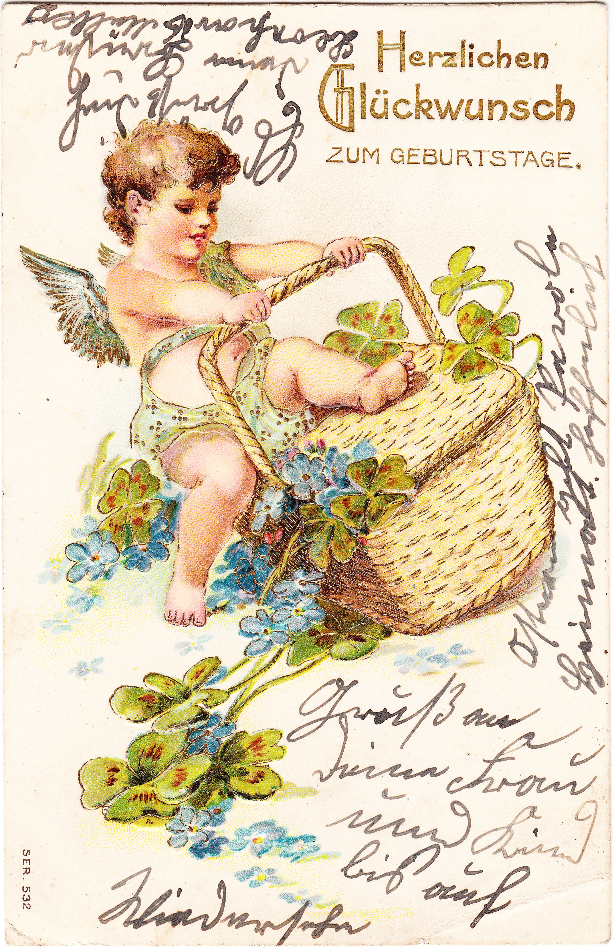 Als Nebenmotiv zum Hauptmotiv dieser Prägekarte, einer auf einem Korb sitzenden Putte, wurden 11 vierblättrige Kleeblätter als Glückssymbol sowie zahlreiche Vergißmeinnicht dargestellt. Das Vergissmeinnicht ist ein Symbol für zärtliche Erinnerung sowie für Abschied in Liebe. Die Putte versucht also augenscheinlich mit all ihrer Kraft, den mit Erinnerungen und Glücksmomenten gefüllten Korb zuzuhalten, was ihr jedoch nicht komplett gelingt.