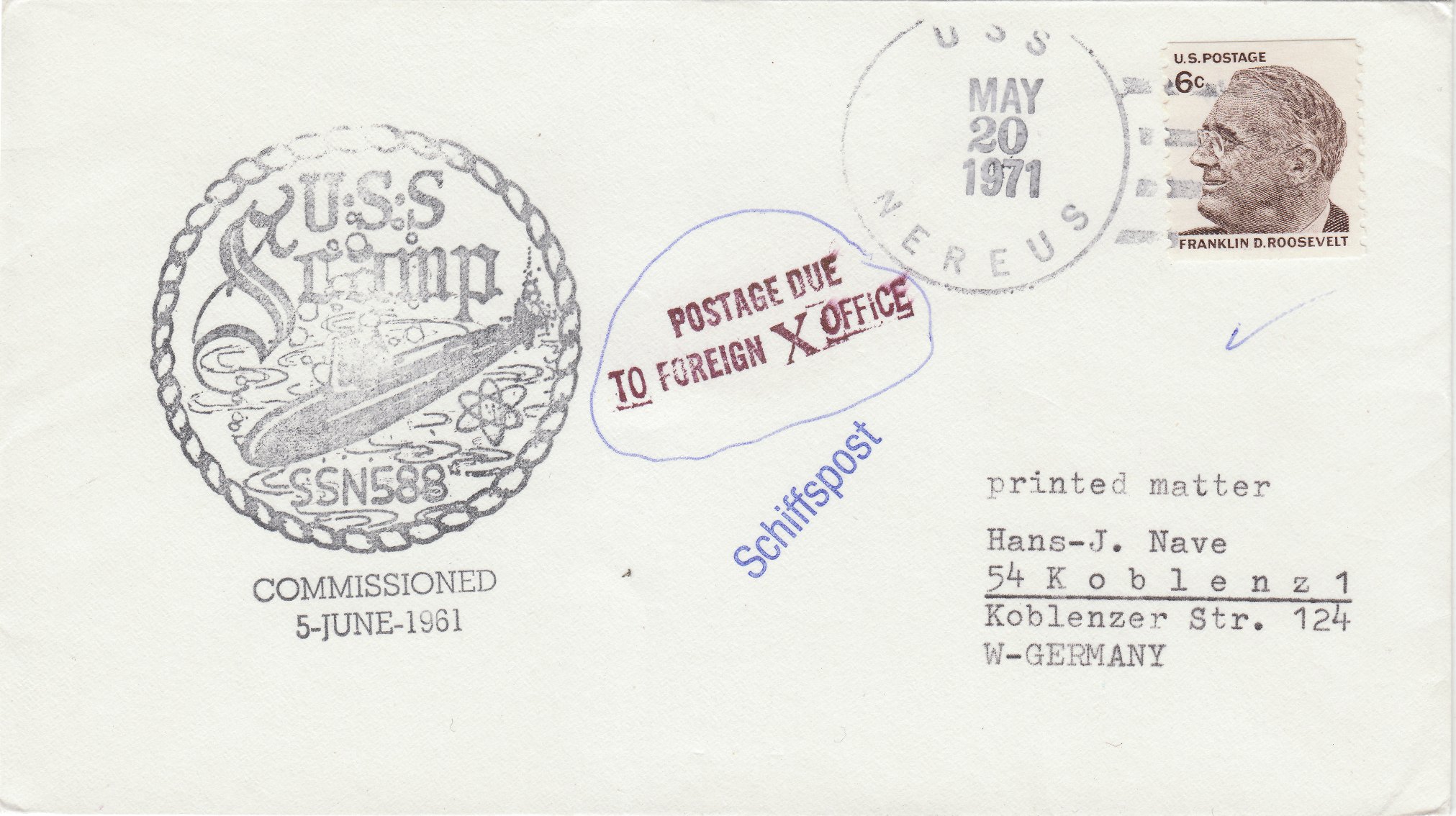 Die Frankatur wurde auf dem U-Boot-Tender USS NEREUS (AS-17) entwertet. Die USS NEREUS wurde im selben Jahr 1971 noch außer Dienst gestellt.