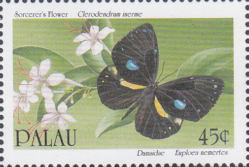 Auf dieser Marke der Palau-Inseln (MiNr 368) ist auf der Marke als Name angegeben: Euploea nemertes. Diesem Namen kann ich nur einen Tagfalter zuordnen, der unter dem Namen Euploea leucostictos nemertes nach langem Suchen zu finden war.