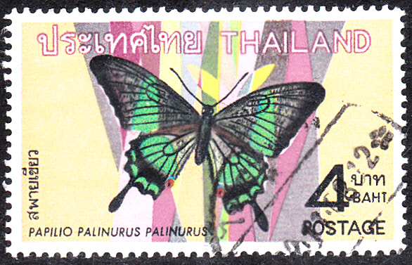 Hier zeige ich eine Marke aus Thailand (MiNr 528) mit einem Neon-Schwalbenschwanz der Unterart Papilio palinurus palinurus.