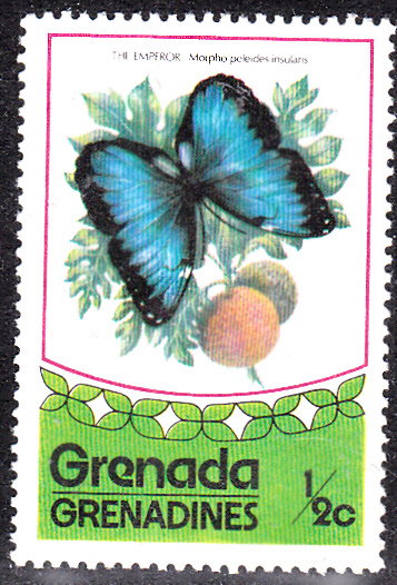 Auf dieser Marke aus Grenada/Grenadinen (MiNr 79) ist ein Blaue Morphofalter (Morpho peleides) in der Unterart Morpho peleides insularis zu sehen.