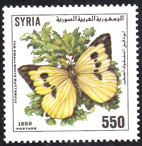 Auf dieser Marke aus Syrien ist ein Kleine Kohlweißling (Pieris rapae; englisch: The Small White Butterfly) zu sehen. Es ist ein Weibchen, zu erkennen an den zwei schwarzen Flecken auf den Vorderfügel, Männchen haben dort nur einen Fleck.