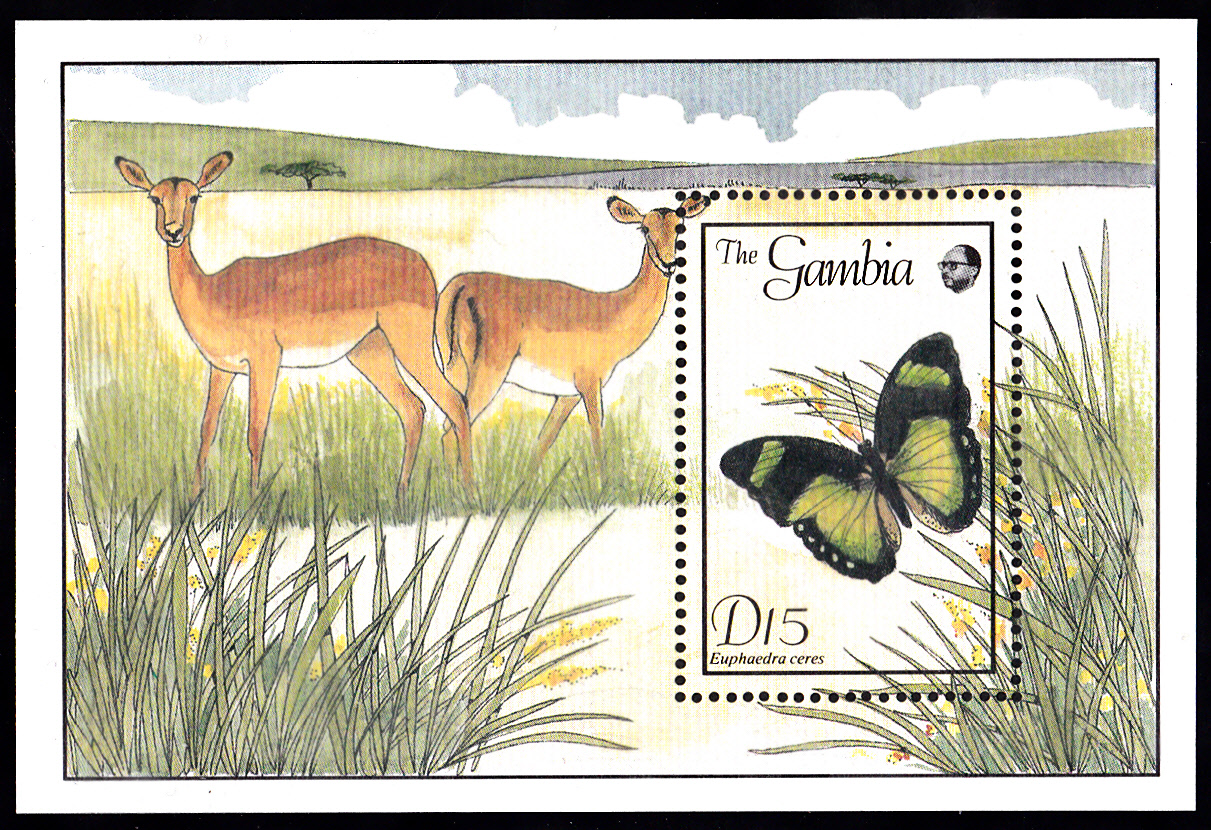 Die Marke (MiNr 872) in diesem Block aus Gambia (MiNr Block 66) bildet einen Euphaedra Ceres ab.