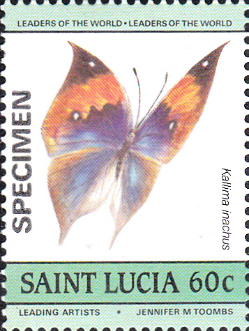 In St.Lucia ist in einer Serie auch eine Marke (MiNr 736) mit einem Kallima inachus erschienen. Hier zeige ich eine Mustermarke dieser Ausgabe: