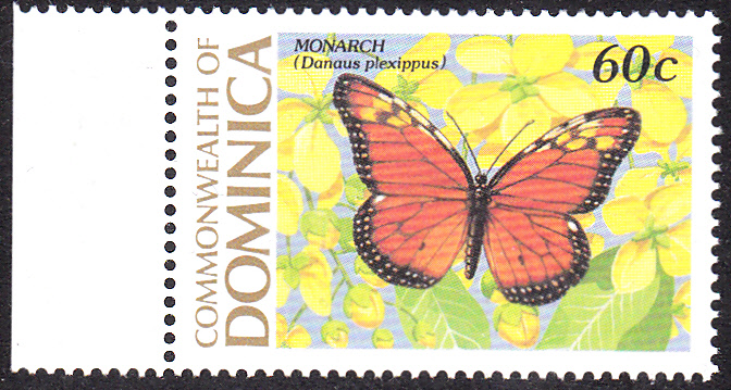 Auf dieser Marke aus Dominica (MiNr 1217) wird ebenfalls ein Monarchfalter (Danaus plexippus) gezeigt.