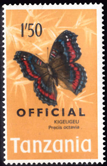 Hier eine Marke aus Sierra Leone (MiNr 1286) mit der nördlichen Unterart (Precis octavia octavia). Diese nördliche Unterart tritt von Sierra Leone bis Somalia auf.