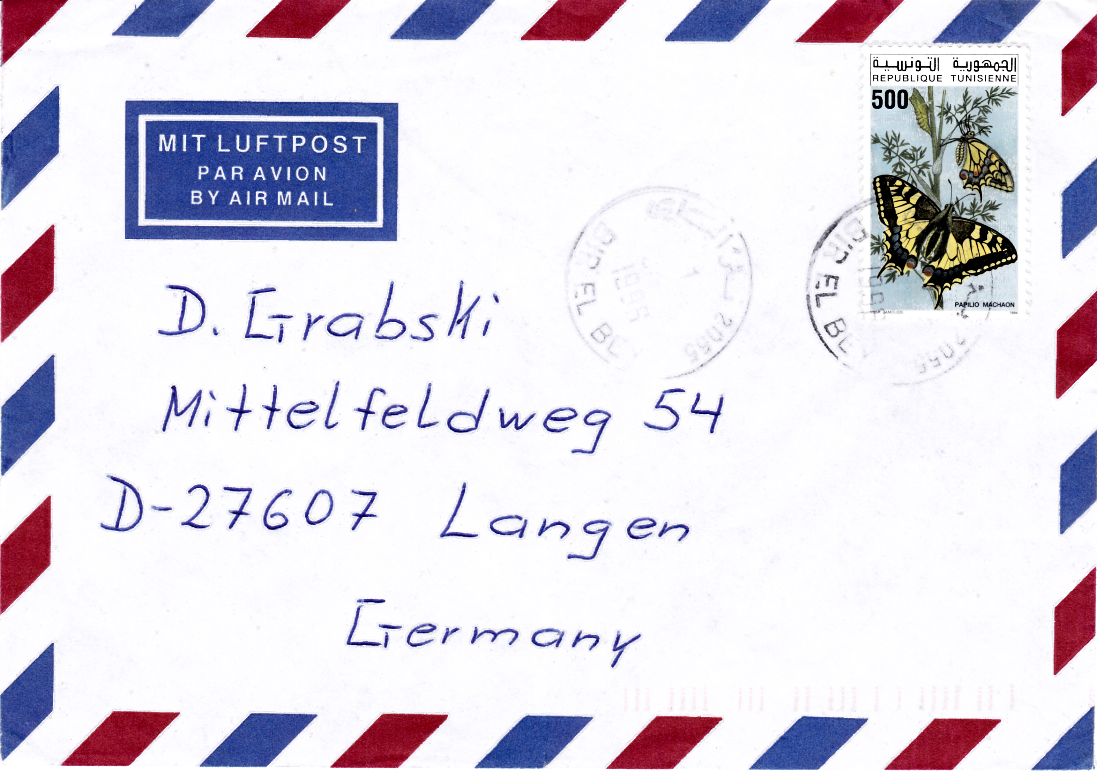 Auf diesem Brief wurde die hier bereits gezeigte Jugendmarke (MiNr 1516) mit dem Schwalbenschwanz (Papilio machaon) zusammen mit vier weiteren Marken der gleichen Serie mit dem Ersttagsonderstempel Bonn gestempelt. Der Brief wurde portogerecht frankiert (Brief 21-50 Gramm 120Pf, Einschreiben 250Pf, zusammen 420Pf).