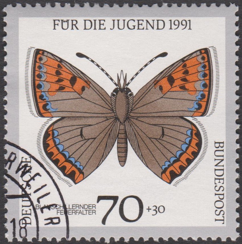 Die bereits hier gezeigte Marke aus Kanada (MiNr 1091) mit Idas-Bläulingen (Plebejus idas; Michel nennt als Name "Lycaeides Idas") wurde mit drei weiteren Marken zusammenhängend als Viererblock oder Viererstreifen gedruckt.