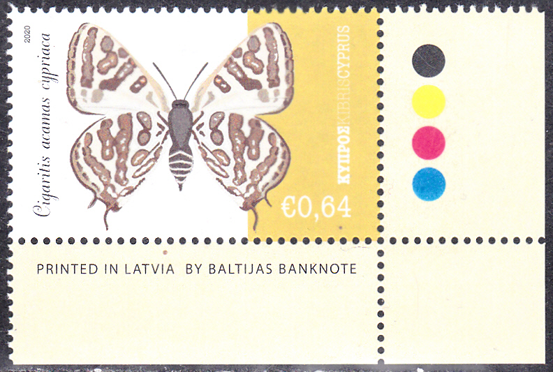 Aus Zypern kommt diese Marke (MiNr 1426) mit einem Cigaritis acamas cypriaca.