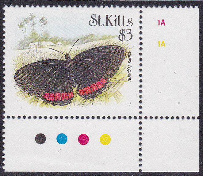 Hier ein Eckrandstück einer Marke aus St. Kitts (MiNr 274) mit einem Biblis hyperia. Im Michel wird er Rotrandfalter (Biblis hyperia) genannt.