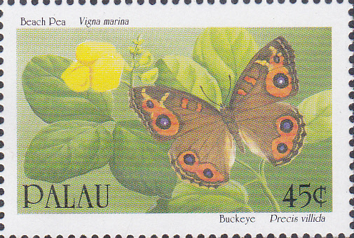Diese Marke der Palau-Inseln (MiNr 367) zeigt einen Junonia villida. Bei Michel wird ein Synonym als Name verwandt: Precis villida, auf der Marke heißt er Buckeye (Precis villida).