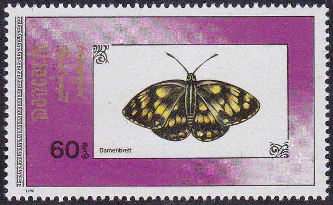 Hier eine Marke ais der Mongolei mit einem Schachbrett oder Damenbrett (Melanargia galathea).