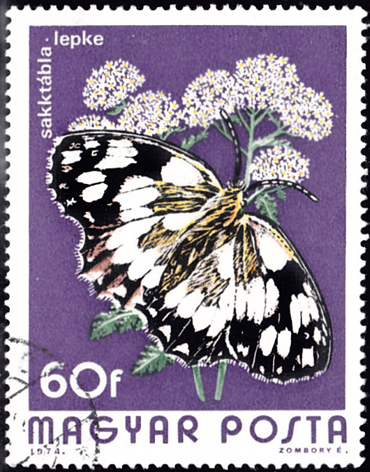 Auch diese Marke aus Ungarn (MiNr 2995 A) zeigt ein Schachbrett oder Damenbrett (Melanargia galathea).