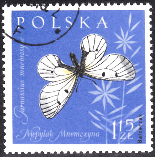 Hier kann ich eine Marke aus Polen (MiNr 1283) mit einem Schwarzen Apollo (Parnassius mnemosyne) zeigen.