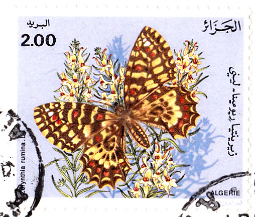 Auf dieser Marke aus Algerien (MiNr 1050) sehen wir einen Spanischen Osterluzeifalter (Zerynthia rumina).