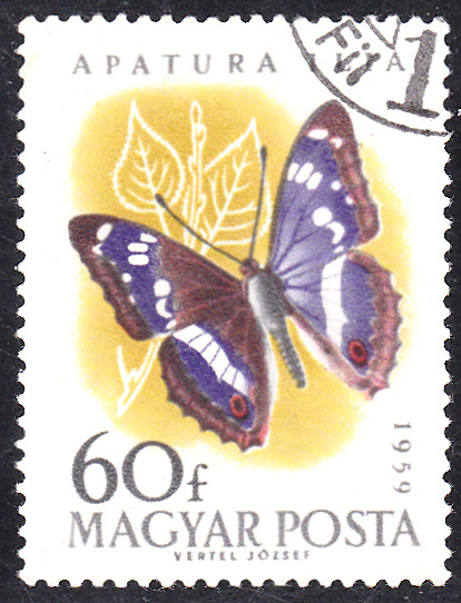 Auf dieser Marke aus Ungarn (MiNr 1635 A) wird ebenfalls ein Schillerfalter gezeigt. Laut Beschriftung auf der Marke wird ein Kleiner Schillerfalter (Apatura ilia) gezeigt, im Michel wird das Motiv mit Großer Schillerfalter (Apatura iris) bezeichnet. Da beide Arten sich im Wesentlichen nur durch die Größe unterscheiden, kann ich den abgebildeten Falter nicht eindeutig zuordnen.