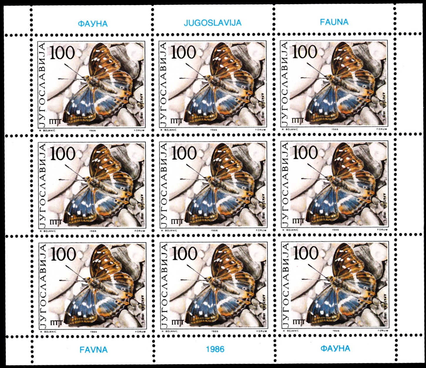 Die bereits gezeigte Marke aus Jugoslawien (MiNr 2174) mit einem Großen Schillerfalter (Apatura iris) ist als Kleinbogen mit 9 Marken erschienen. Heute kann ich hier auch einen kompletten Kleinbogen zeigen.