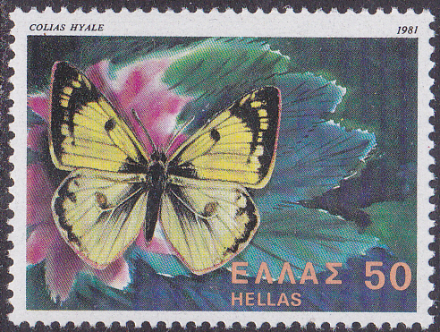 Diese Marke aus Griechenland (MiNr 1461) bildet eine Goldene Acht (Colias hyale) ab. Im Michel wird die Beschreibung mit Gelber Heufalter (Colias hyale) angegeben.