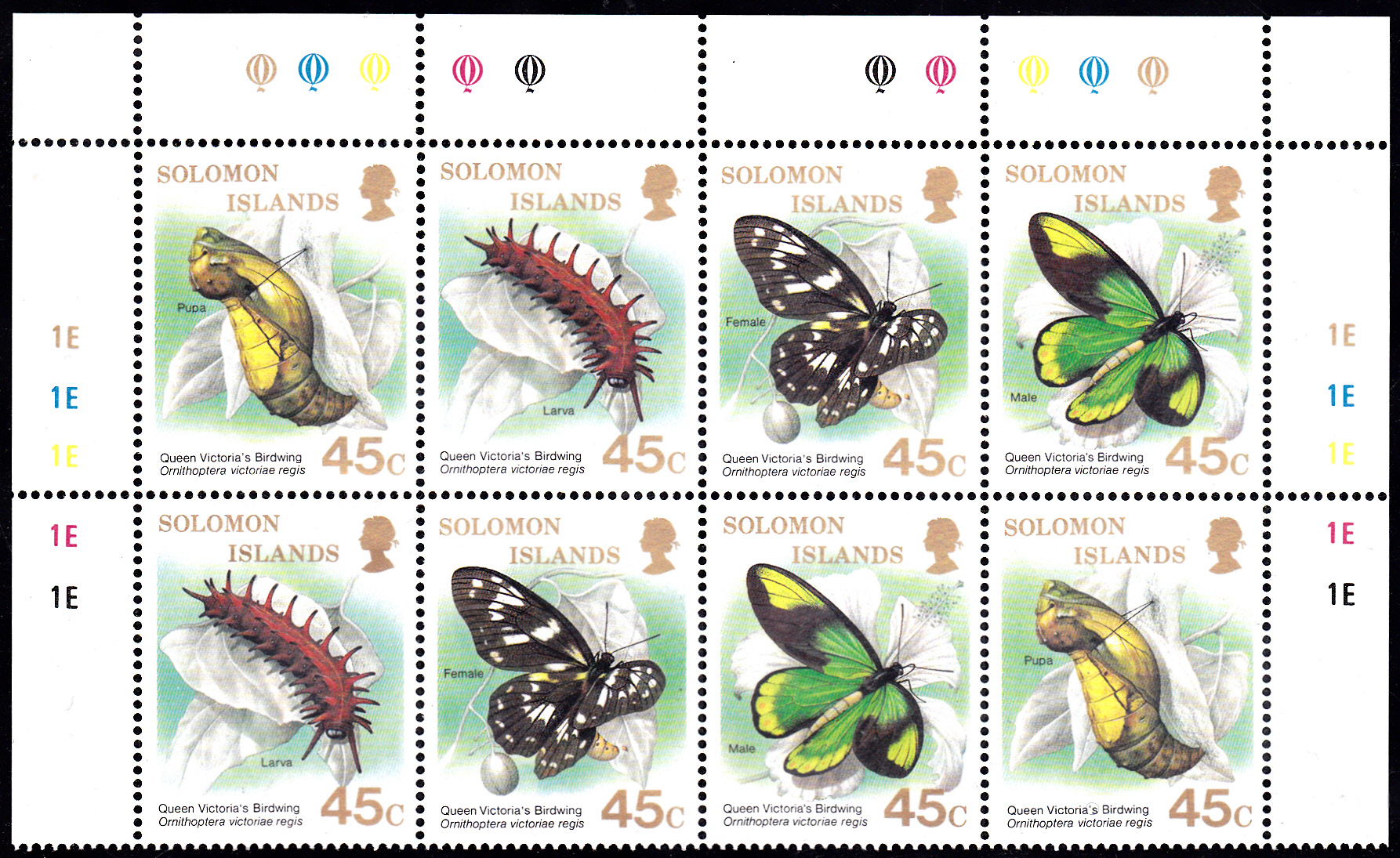 Diese Marke der Salomoninseln (MiNr 670) zeigt ein Männchen einer Unterart des Königin-Viktoria-Schmetterling (Ornithoptera victoriae regis).