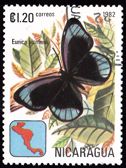 Aus Nicaragua kommt diese Marke (MiNr 2q255) mit einem Eunica alcmena.