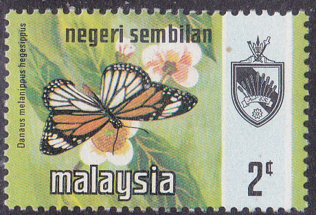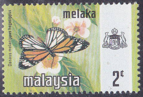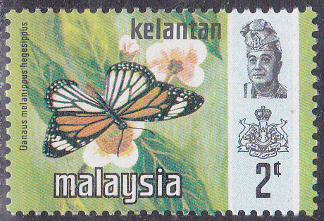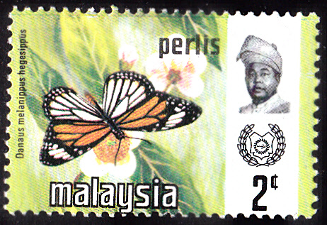 Auf dieser Marke aus Perlis (MiNr 48), einem der Malaiischen Staaten, ist ein Vertreter der Unterart Danaus melanippus hegesippus zu sehen.