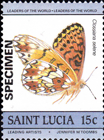 In St.Lucia ist in einer Serie auch eine Marke (MiNr 732) mit einem Braunfleckigen Perlmutterfalter (Boloria selene) erschienen. Hier zeige ich eine Mustermarke dieser Ausgabe: