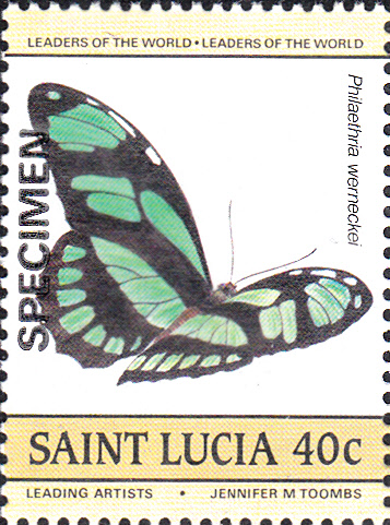 In St.Lucia ist in einer Serie auch eine Marke (MiNr 734) mit einem Philaethria wernecki erschienen. Hier zeige ich eine Mustermarke dieser Ausgabe:
