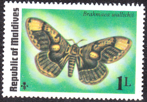 Auf dieser Marke der Malediven (MiNr 604) ist ein Brahmaea wallichii abgebildet.