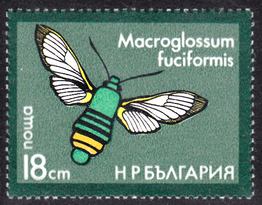 Hier eine Marke aus Bulgarien (MiNr 2441) mit einem Hummelschwärmer (Hemaris fuciformis). Im Michel und auf der Marke wird er mit Macroglossum fuciformis bezeichnet.