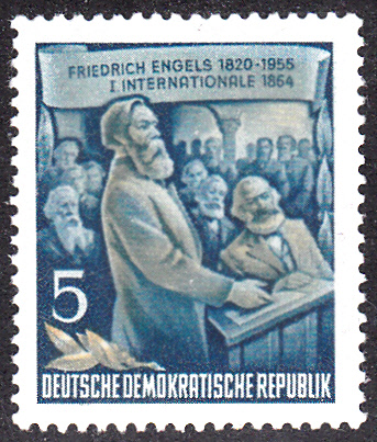 Auf der Marke zu 5Pf (MiNr 485 A) sehen wir Friedrich Engels und Karl Marx im Generalrat der I. Internationale im Jahre 1864.