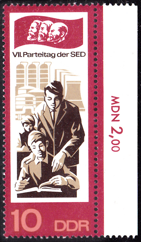 Auf der Marke zu 10Pf (MiNr 1269) aus der gleichen Serie sind ein Lehrer mit Schülern, eine Industrieanlage und eine Flagge mit Kopfbildern von Marx, Engels und Lenin zu sehen.