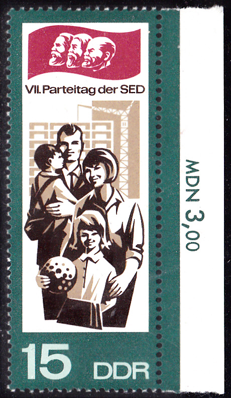 Zum Parteitag der Sozialistischen Einheitspartei Deutschlands (SED) im Jahre 1967 erschien in einer weiteren Serie diese Marke zu 5 Pfennig (Minr 1268) mit einem Traktorfahrer, landwirtschaftlichen Maschinen und einer Flagge mit Kopfbildern von Marx, Engels und Lenin.