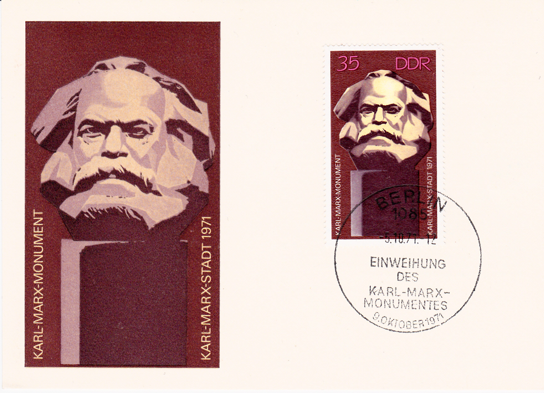 Zur Einweihung des Karl-Marx-Monuments in Chemnitz (Karl-Marx-Stadt) erschien in der DDR diese Marke (MiNr 1706) mit einer Abbildung des Karl-Marx-Monument von Lew Kerbel (1917-2003; sowjetischer Bildhauer).