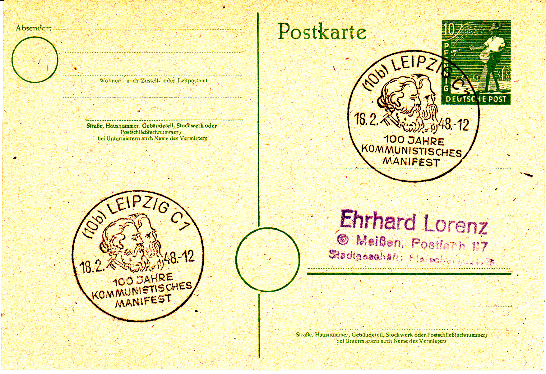 Sonderstempel aus Leipzig vom 18.2.1948 anlässlich "100 Jahre kommunistisches Manifest". Im Stempelbild sind Kopfbilder von Karl Marx und Friedrich Engels zu sehen.