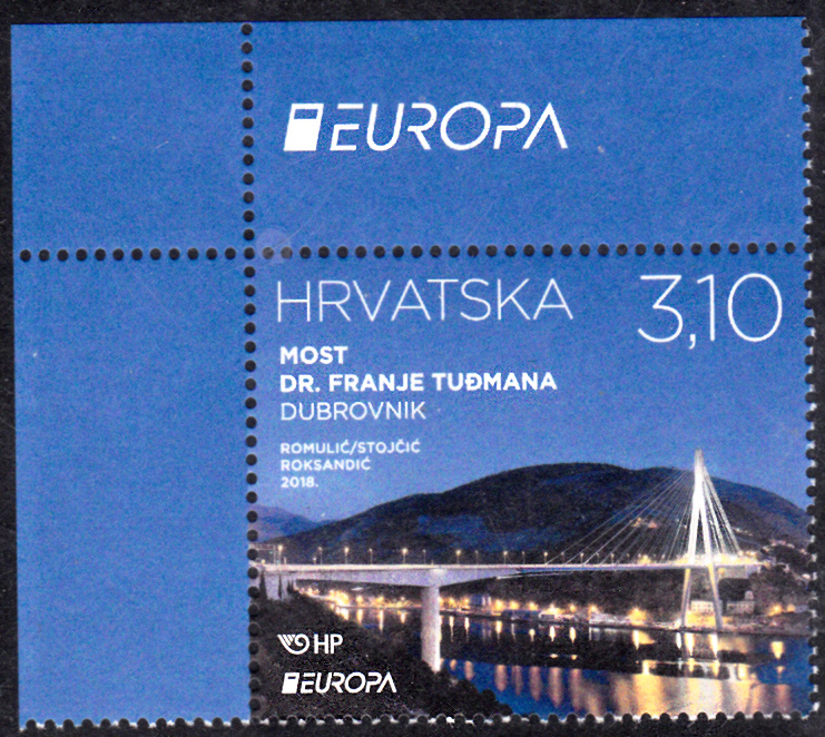 In Kroatien erschienen die Europamarken 2018 zum Gemeinschaftsthema "Brücken" am 2.5.2018. Hier eine der beiden Marken zu 3,10K mit einer Abbildung der Franjo-Tuđman-Brücke in Dubrovnik. Die Auflage dieser Marke beträgt 300 000 Stück.