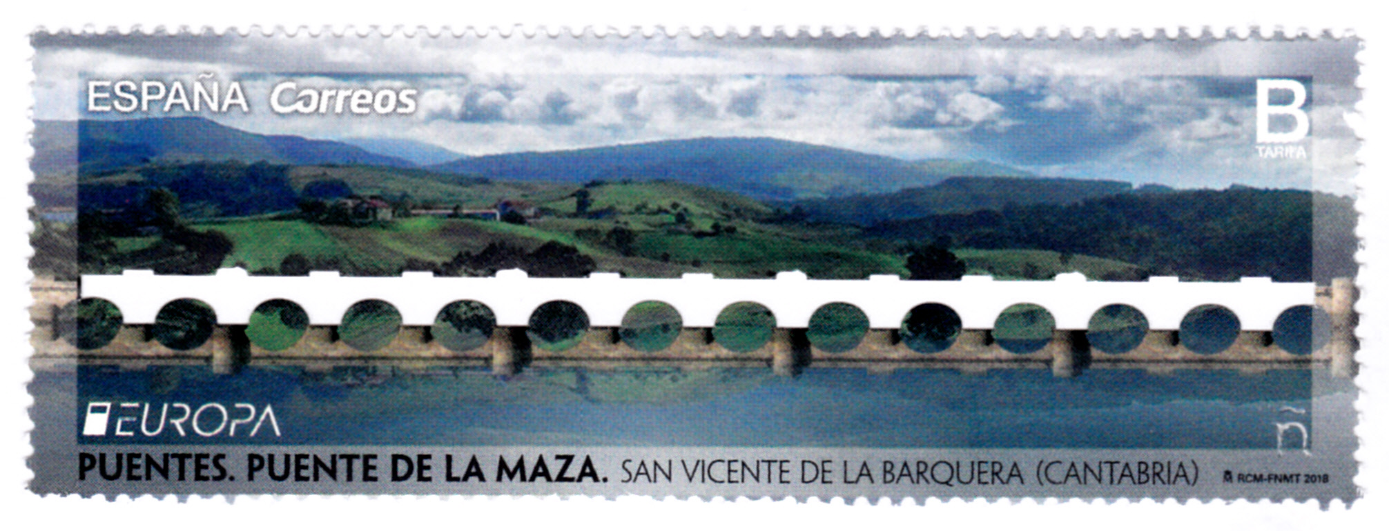 In Spanien erschien eine Europamarke 2018 zum Gemeinschaftsthema "Brücken" am 23.04.2018. Hier die Marken in der Wertstufe "B" (Nominale zur Zeit der Ausgabe = 1.35 €) mit der Abbildung der Maza-Brücke in San Vicente de la Barquera. Die Marke ist selbstklebend.