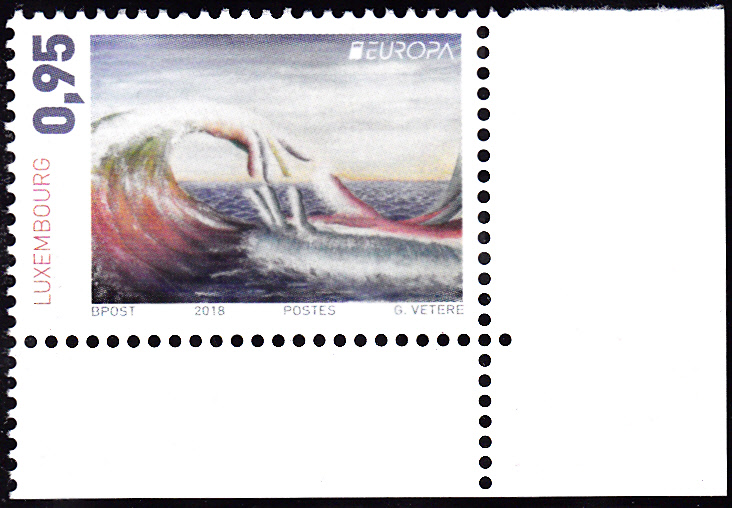 In Luxemburg erschienen die Europamarken 2018 zum Gemeinschaftsthema "Brücken" am 15.5.2018. Die Marken zeigen Kinderzeichnungen der Gewinner des Schülermalwettbewerbs der Luxemburgischen Post. Die Marke zu 95 Cent zeigt eine Zeichnung mit Welle und Händen von Gaia Vetere.