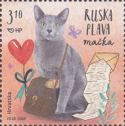 Auf dieser Marke aus einer Serie aus Kroatien (MiNr 1303) wird eine Katze der Rasse "Russisch Blau" abgebildet.