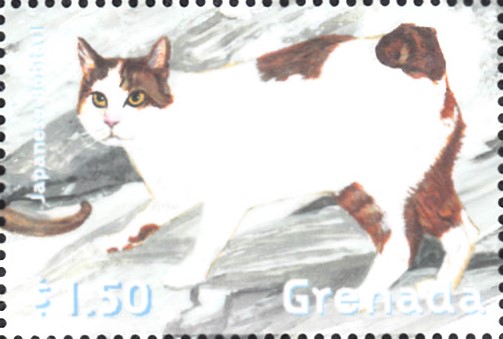 Auf einer Marke aus Grenada (MiNr 4252) können wir eine japanische Stummelschwanzkatze sehen.