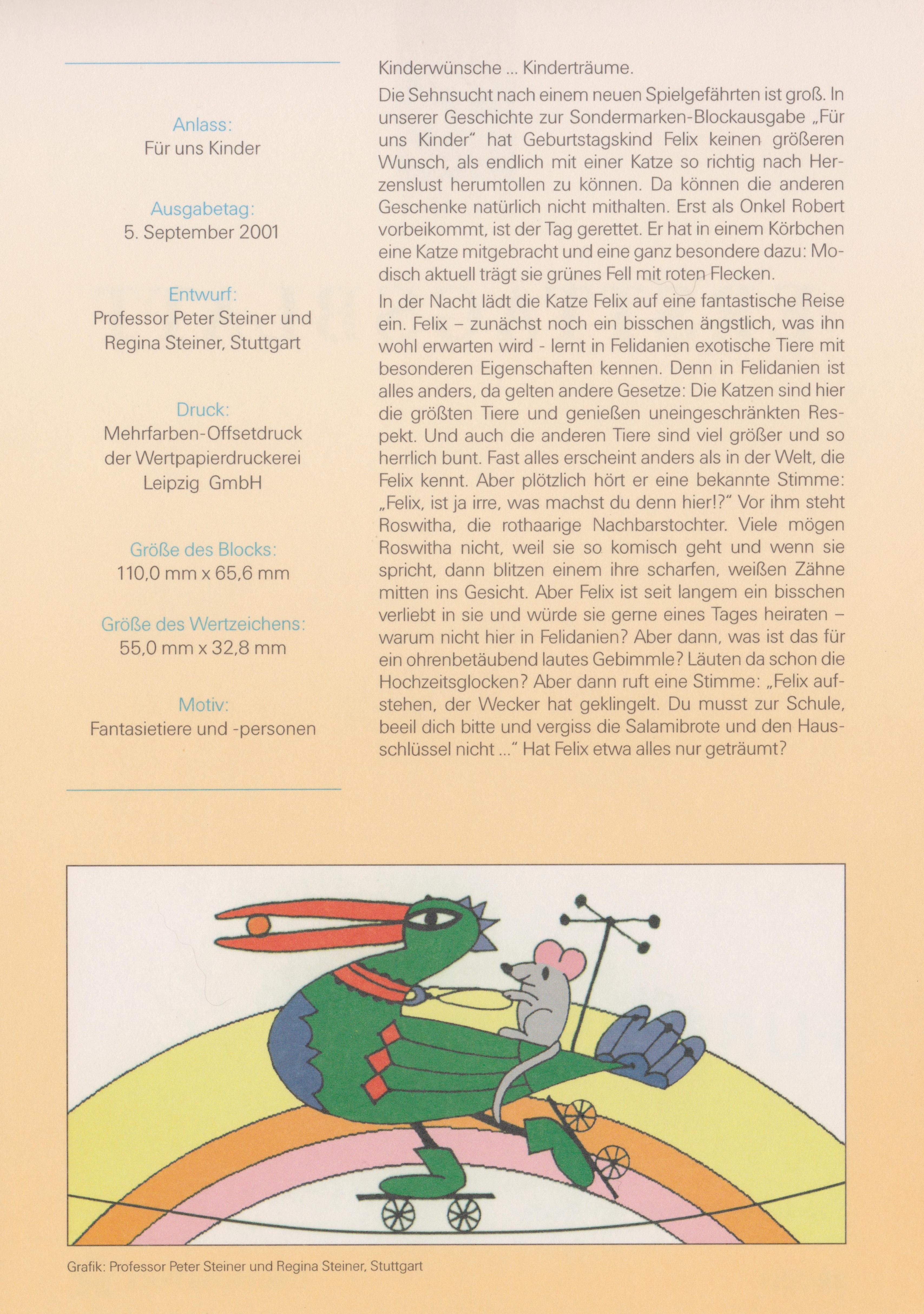 Bund Block 55 mit MiNr. 2212 zeigt als Hauptmotiv eine gezeichnete Hauskatze, hier auf ETB 38/2001: